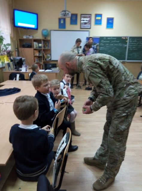 Сергій був журналістом Нового каналу, телеведучим, але почуття відповідальності за долю Батьківщини покликало його відмовитись від улюбленої професії і поїхати на схід воювати за незалежність нашої держави. По батьківському щиро і дохідливо воїн розповів дітям, якими вони повинні зростати, які книжки читати, обов’язково займатися спортом, які людські якості в собі виховувати. Не обійшлося і без подарунків. Діти отримали у подарунок браслети, а хлопці - справжні військові шеврони. Ще до 2-Б класу завітали пластуни, які провели майстер-клас по плетінню з паракордового шнура «Браслета виживання». Це та річ, яка дуже у багатьох випадках спасає бійців на фронті. Готові браслети були передані Сергію Кутракову і дуже скоро, можливо, спасуть не одне життя або просто допоможуть у скрутний момент.