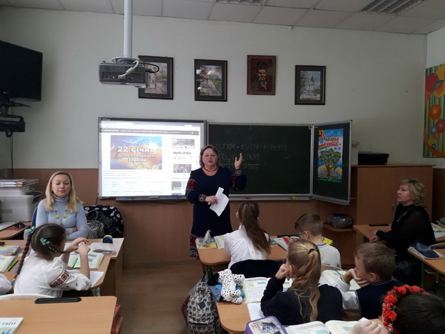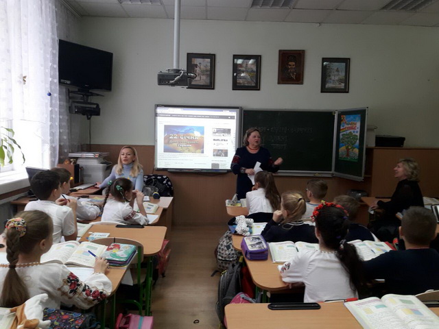 22 січня 2018 року для гімназистів 4-А класу було проведено інтерактивне заняття «Сяйво Злуки» до Дня Соборності України за участю співробітника бібліотеки ім. Є. Плужника Вавілової Валентини Олексіївни та завідуючої бібліотеки Чумак Тетяни Леонідівни.