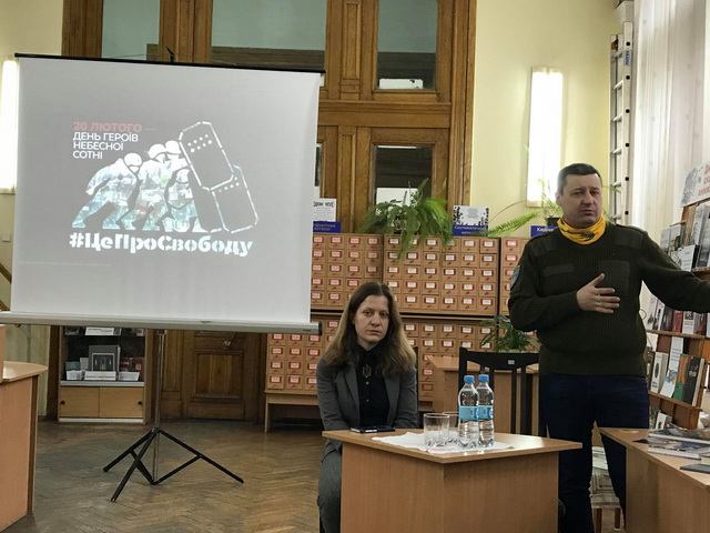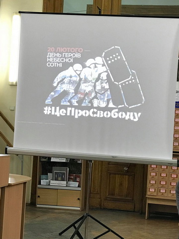 20 лютого 2019 року гімназисти 10-11 класів гімназії №48 на чолі з заступником директора з виховної роботи Чистяк О.І. брали участь у диспуті «На варті ваших душ Небесна Сотня» на базі бібліотеки ім. Є Плужника. Учні з цікавістю спілкувалися з учасником самооборони Майдану Романом Орищенком, який розповідав про події Майдану 5 років тому. Ольга Сало, керівник проекту Національного музею Революції гідності, у формі діалогу з учнями, розповіла хронологію тих трагічних для українського народу подій.