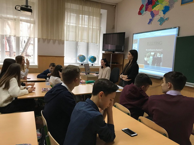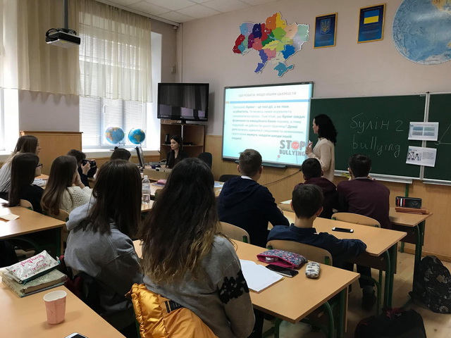 01 березня 2019 року для гімназистів 8-А класу був проведений інтерактивний урок «Особливості та види булінгу в школі» студентами IV курсу напряму підготовки «Соціальна педагогіка» Інституту людини Київського університету імені Бориса Грінченка – Петіною Владою та Лівіцькою Альоною. Під час уроку гімназисти мали змогу висловити свою власну думку, поставити питання, які їх хвилюють, проаналізувати рекомендації щодо уникнення булінгу.