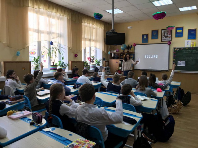 18 березня 2019 року в рамках циклу уроків з профілактики булінгу був проведений інтерактивний урок «Булінг за партою» для гімназистів 4-Б класу студенткою ІV курсу напрямку підготовки «Соціальна педагогіка» Інституту людини Київського університету імені Б. Грінченка – Левицькою Альоною. Студентами Бранирською Катериною та Захарчук Євгенією були проведені уроки з розвитку креативності «Метелики наших мрій» для гімназистів 2-Б та 3-А класів. Під час уроків діти отримали навички у навчально-творчій роботі з папером та чудовий настрій.