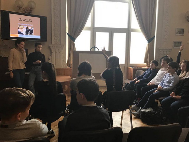 19 березня 2019 року в рамках циклу уроків з профілактики булінгу були проведені інтерактивні уроки «Булінг за партою» для гімназистів 6-А та 6-Б класів студентами IV курсу напрямку підготовки «Соціальна педагогіка» Інституту людини Київського університету імені Б. Грінченка – Левицькою Альоною, Петіною Владою та Левченко Дарією під керівництвом соціального педагога Лашковою Г.С. Під час уроків гімназисти висловлювали свою власну думку щодо явища булінгу, вміння пошуку шляхів виходу зі складної ситуації, отримали навички відповідальної та безпечної поведінки, толерантного спілкування.