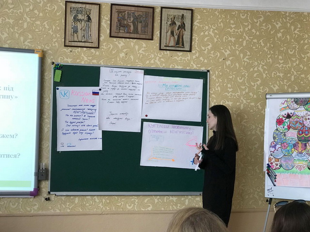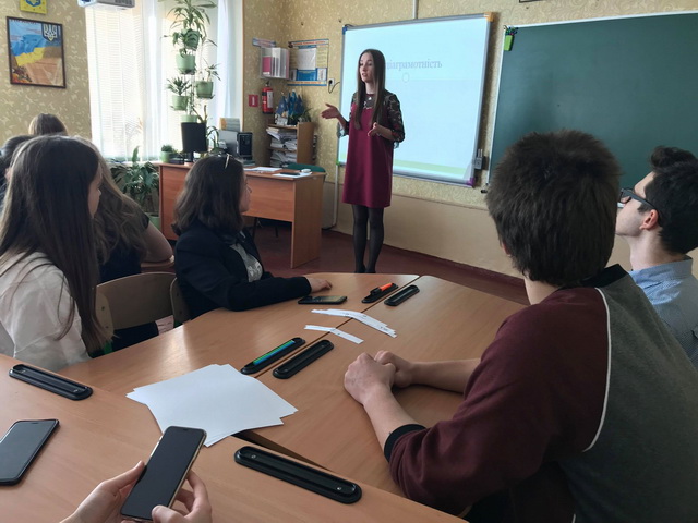 В рамках районного проекту «Інтелектуальні інвестиції» 08 квітня 2019 року гімназисти 9-10 класів на чолі з соціальним педагогом Лашковою Г.С. відвідали інтерактивний урок «Медіаграмотність та освіта» на базі ЗССО №27. Під час уроку виявили фейки, маніпуляції та пропаганду ознайомилися зі світом медіа. Гімназисти мали змогу перевірити свої знання та навички з медіаграмотності та критичного мислення, а також покращити їх в ігровій формі.