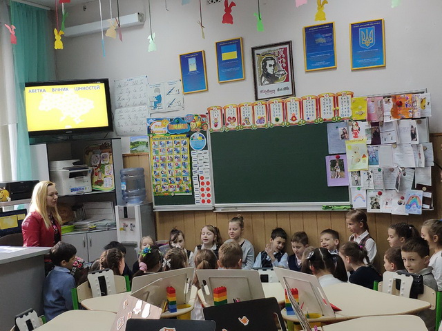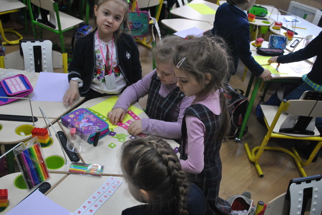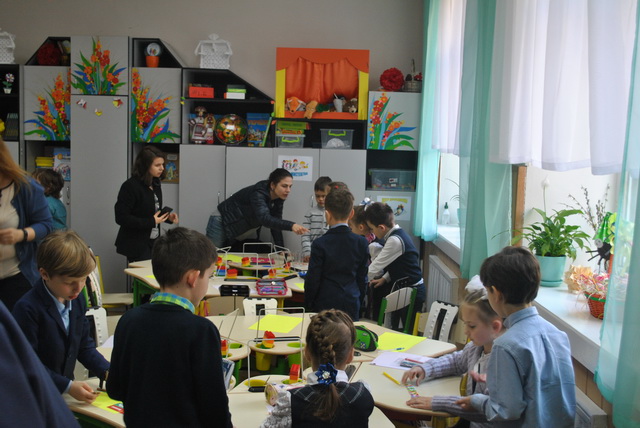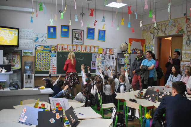 Вернісаж відкритих уроків в гімназії №48 23 квітня 2019 року - «Майстерня розумників і дослідників» - блискавично розпочався грою «Абетка вічних цінностей» в 1-х класах Нової української школи. За участі батьків діти виконували творчі завдання в командах, знайомилися із найважливішими сенсами життя.