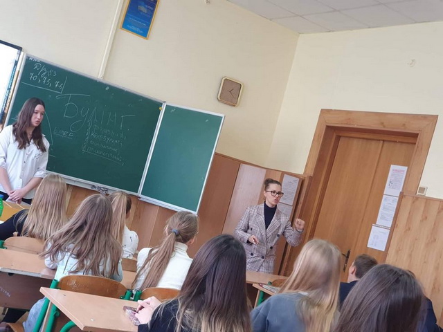 24 вересня 2019 року для гімназистів 7-х класів було проведено інтерактивне заняття «Безпечна школа» за участю членів ради самоврядування та соціального педагога Лашкової Г.С. Обговорювалися поняття булінг, види та форми булінгу, аналізувалися приклади шкільного насилля та прогнозувалися його наслідки.