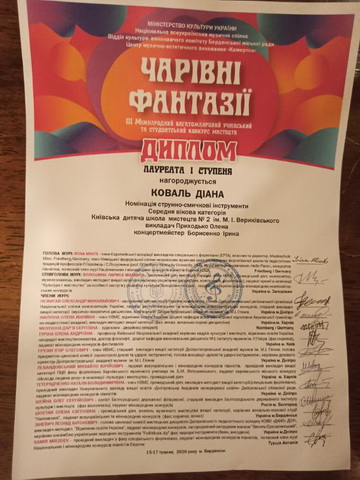 - Коваль Діану, скрипка, ученицю 5- Б класу гімназії №48.