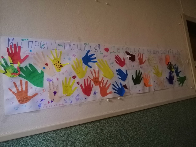 Маленькі гімназисти 2-Б класу разом з психологом Білоноженко М.С. долучилися до акції та створили свій неповторний плакат «Долоньки не для биття!»
