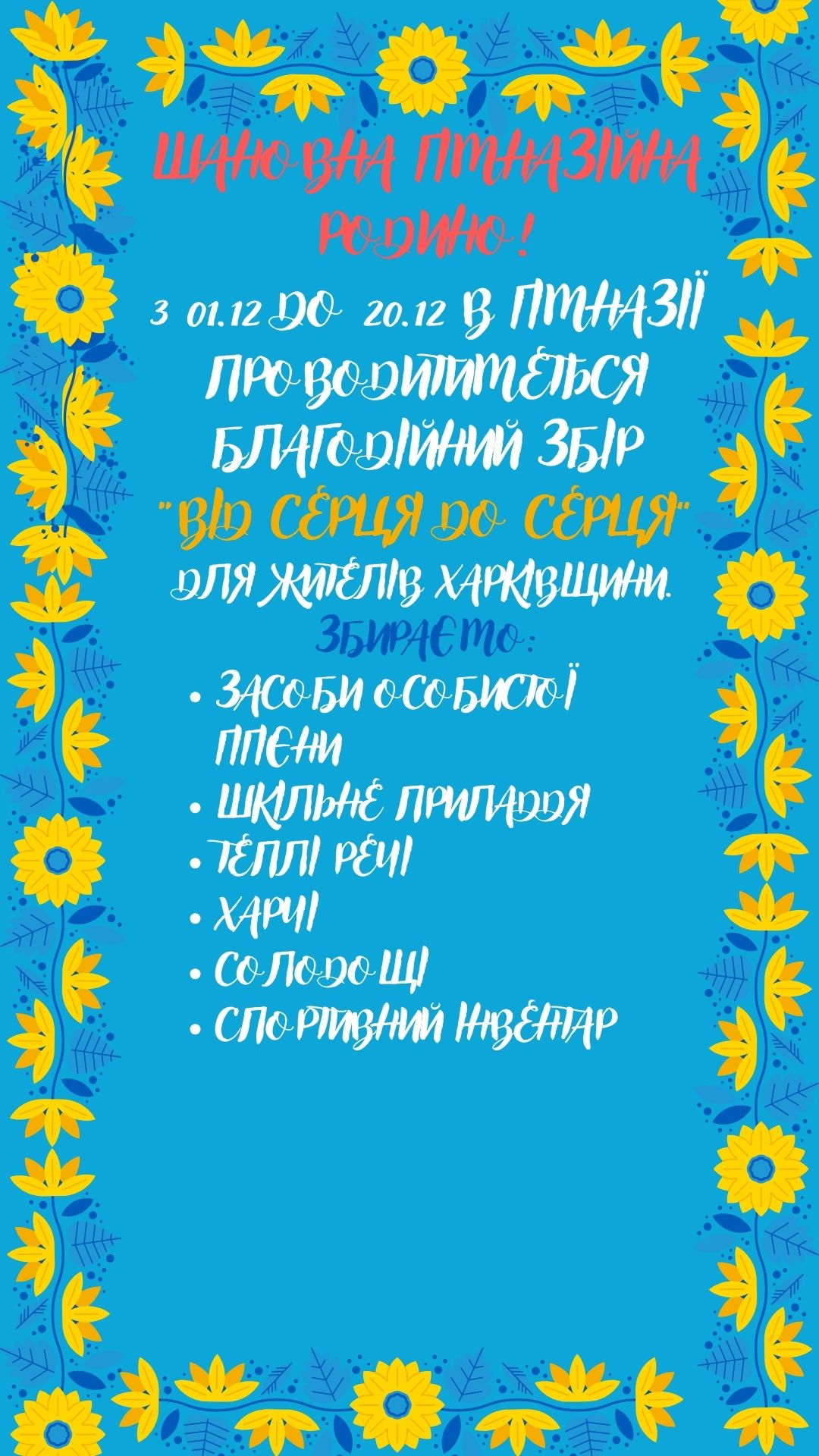 Щиро дякуємо всій гімназійній родині – учням, батькам та вчителям, всім, хто долучився до традиційної благодійної акції «Добро заради майбутнього», яку проводила громадська організація «Благовіст 2013», в рамках якої були зібрані необхідні речі – теплий одяг, речі першої необхідності, іграшки, солодощі, книги, спортивний інвентар для допомоги малозабезпеченим та багатодітним родинам, дітям з розладами здоров’я та родинам з числа ВПО Харкова та Харківської області. Робимо добрі справи разом!
