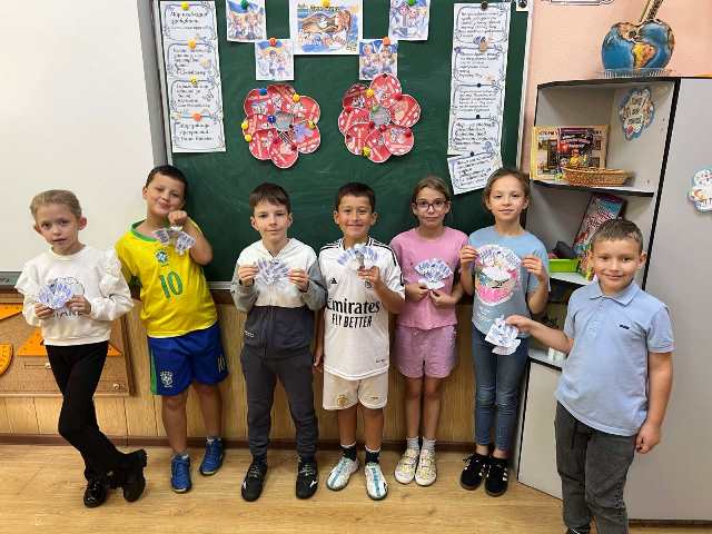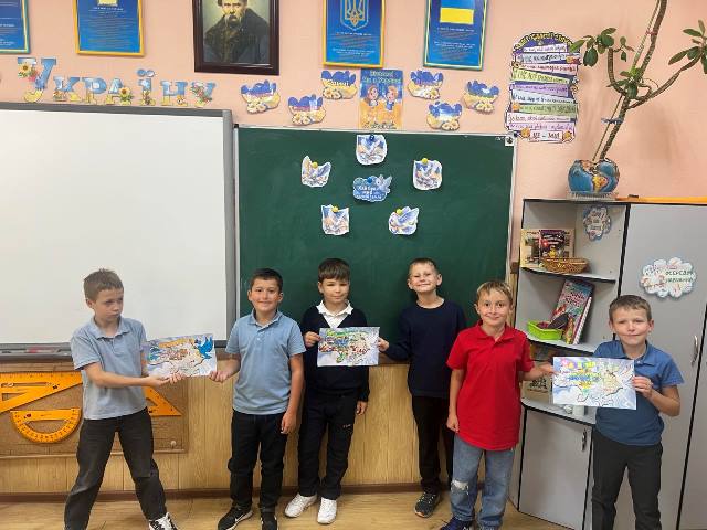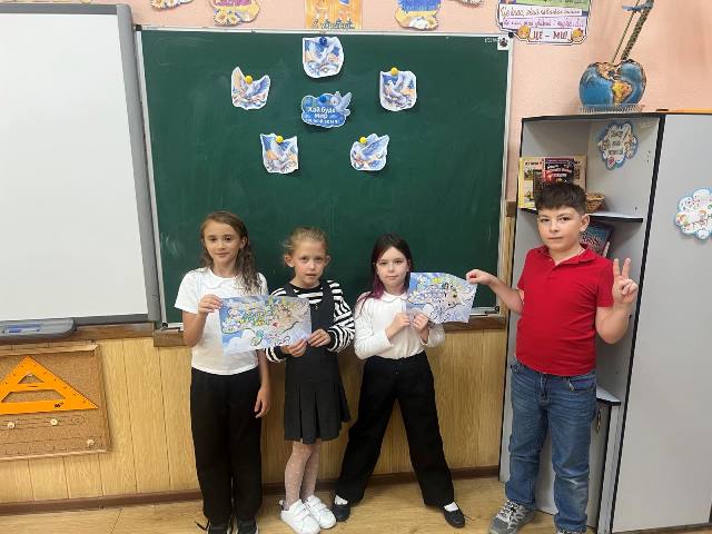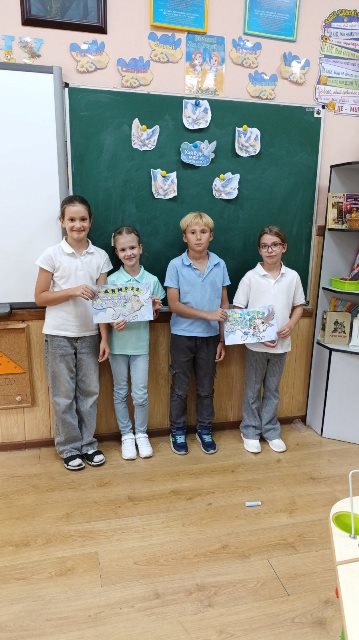 Учні 3-А класу гімназії №48 разом з класоводом Горбаньовою І.В. обговорювали ці питання, що для кожного означає мир, в парах розфарбували малюнок, створили листівку із символом миру – голубом.
