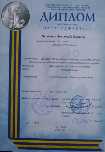 Вітаємо ученицю 11-А класу гімназії №48 Шевченківського району міста Києва - Нестеряк Анастасію Юріївну, яка була нагороджена дипломом другого ступеня за перемогу у ІІІ етапі Всеукраїнського конкурсу-захиту науково дослідницьких робіт учнів-членів Малої академії наук України, відділення філософії та суспільствознавства, секція журналістика. Анастасія провела дослідження на тему: «Конвергентність у фешн-журналістиці». Вся гімназійна родина щиро вітає переможницю та бажає подальших наукових злетів.