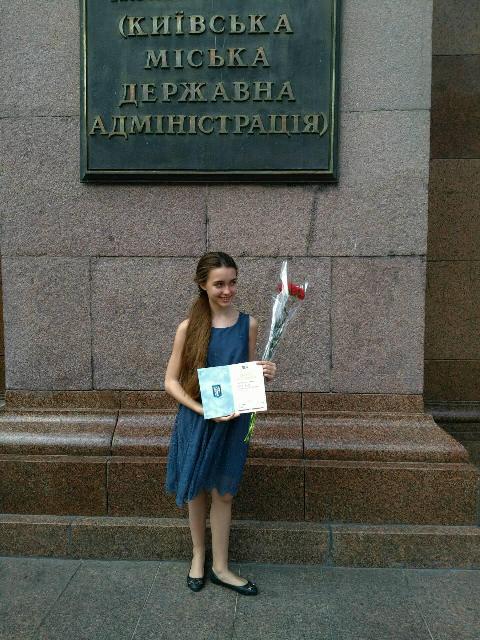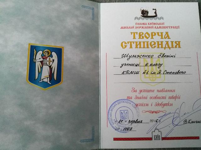Вітаємо ученицю 7-А класу гімназії №48 Шульженко Евеліну з врученням творчої стипендії 1червня 2016 року в Київській міській державній адміністрації "За успішне навчання та значні особисті творчі успіхи і здобутки"