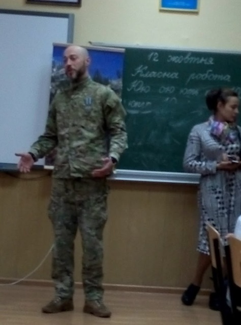 12 жовтня 2016 року у 2-Б класі, класовод – Вакулюк І.В., напередодні Дня Захисника України відбувся Урок патріотизму і мужності. В гостях побував офіцер запасу національної гвардії – Кутраков Сергій.
