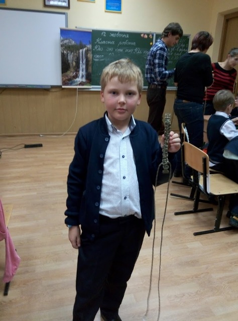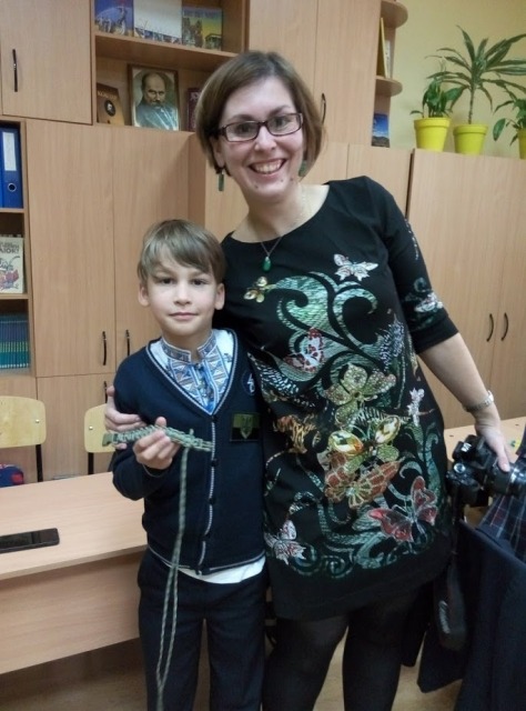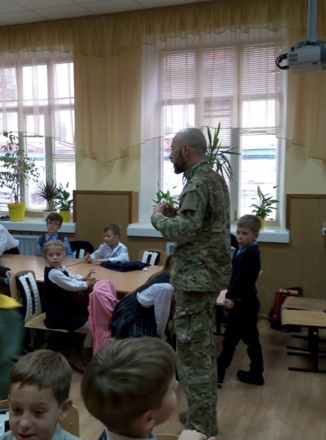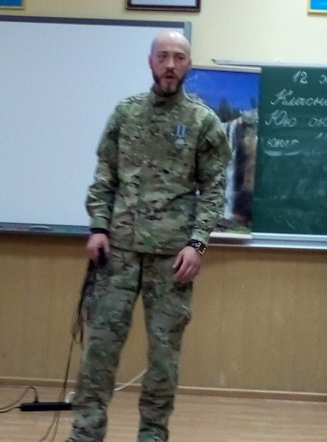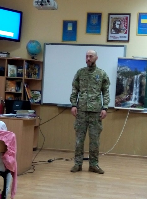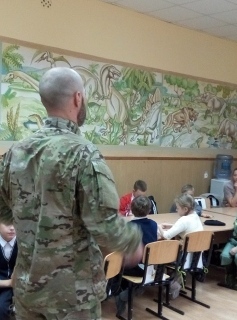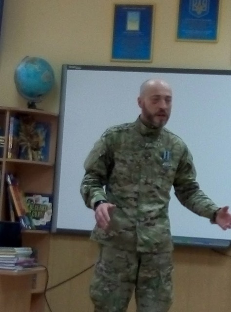 Сергій був журналістом Нового каналу, телеведучим, але почуття відповідальності за долю Батьківщини покликало його відмовитись від улюбленої професії і поїхати на схід воювати за незалежність нашої держави. По батьківському щиро і дохідливо воїн розповів дітям, якими вони повинні зростати, які книжки читати, обов’язково займатися спортом, які людські якості в собі виховувати. Не обійшлося і без подарунків. Діти отримали у подарунок браслети, а хлопці - справжні військові шеврони. Ще до 2-Б класу завітали пластуни, які провели майстер-клас по плетінню з паракордового шнура «Браслета виживання». Це та річ, яка дуже у багатьох випадках спасає бійців на фронті. Готові браслети були передані Сергію Кутракову і дуже скоро, можливо, спасуть не одне життя або просто допоможуть у скрутний момент.