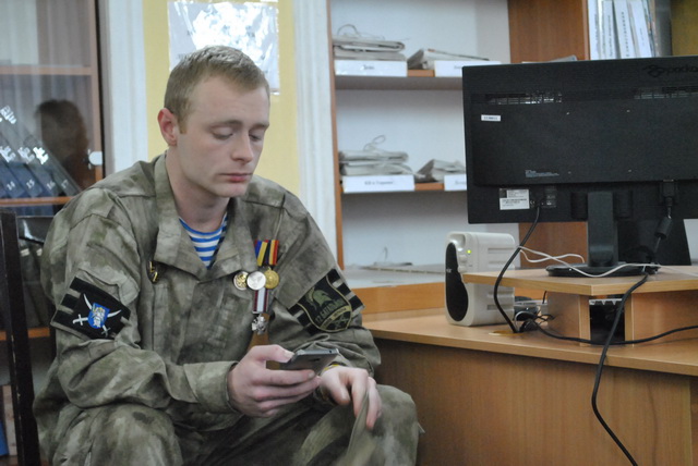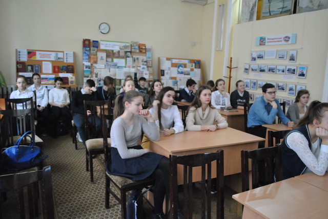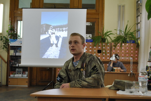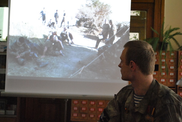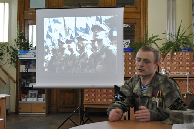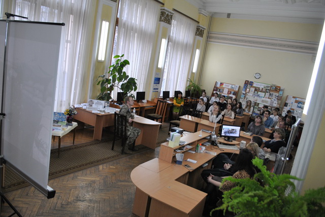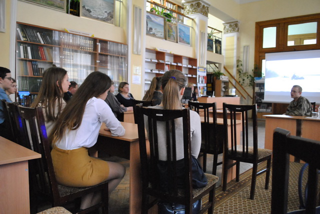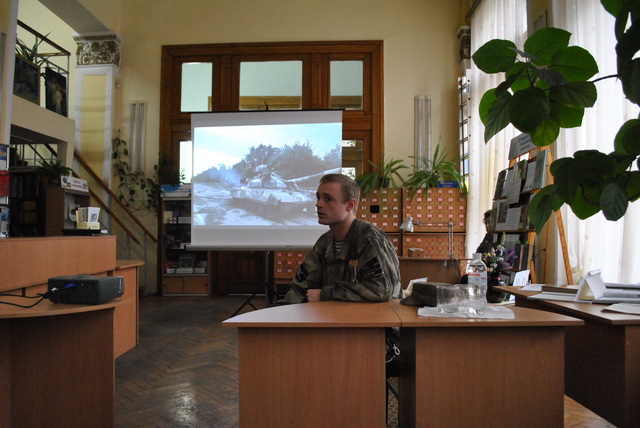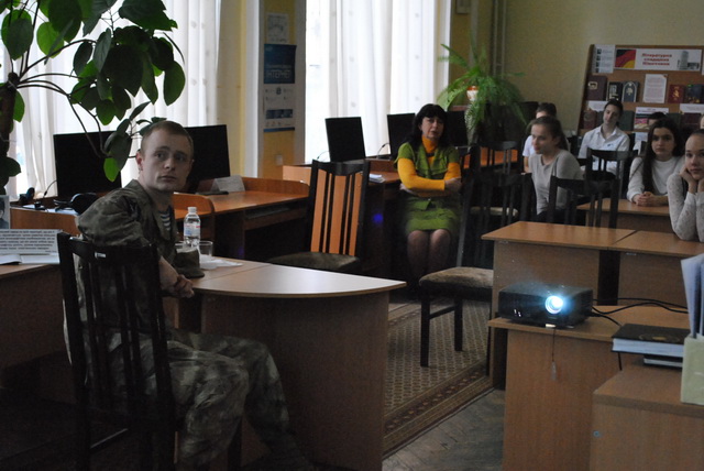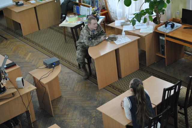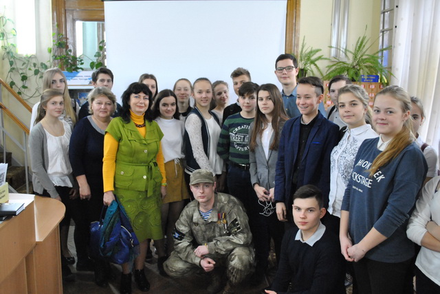 Учні 9-Б класу гімназії №48 на чолі з заступником директора з виховної роботи Чистяк О.І. зустрілися з учасником АТО, добровольцем 12 батальйону ТРО – Фармагеєм Артемом Станіславовичем на базі бібліотеки ім. Є. Плужника. Відбулась відверта розмова про реальне життя захисників Вітчизни, їхні проблеми та труднощі.