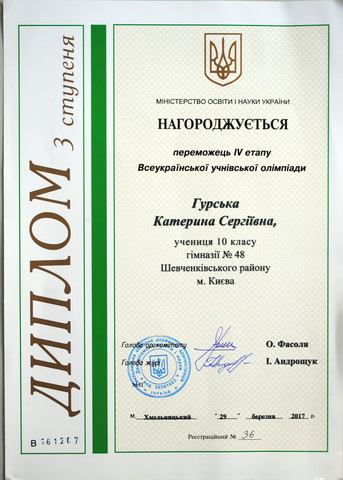 Вітаємо ученицю 10-А класу Міс інтелект гімназії № 48 Гурську Катерину - переможницю ІV етапу ІІІ Всеукраїнської учнівської олімпіади з польської мови та літератури. Олімпіада проходила на базі загальноосвітньої школи І-ІІІ ступенів з польською мовою навчання міста Городка Хмельницької області з 27-29 березня 2017 року. Зичимо наступних перемог !