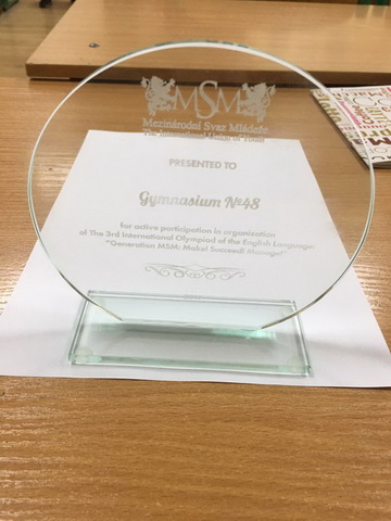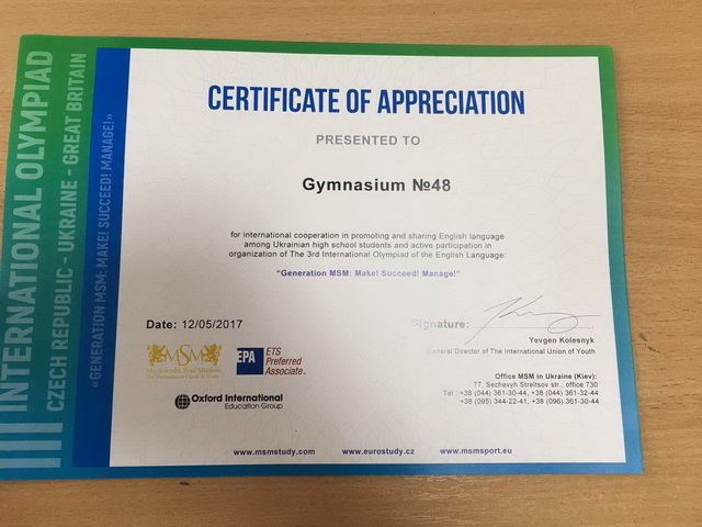12 травня 2017 року в Бізнес Центрі «Леонардо» відбулося нагородження призерів ІІІ Міжнародної олімпіади «Generation MSM: Make! Succeed! Manage!» з англійської мови. Призери отримали сертифікати та знижки на участь у міжнародних навчальних програмах. Гімназія №48 була відзначена за активну участь в олімпіаді. Найкращий результат виявила учениця 9-А Маріанна Іовенко, яка пройшла у ІІІ тур олімпіади та виборола право безкоштовно пройти тест ТОЕFL Junior.