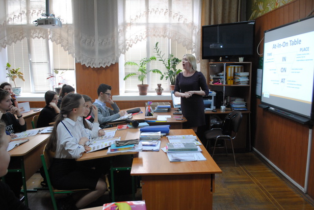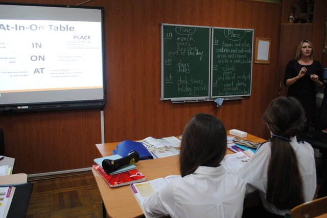Щорічна практика студентів КНЛУ розпочалась з демонстраційного уроку «Prepositions of time and place» вчителя англійської мови Петровської Наталії Мілентіївни, яка показала практикантам сучасні методики використання європейських підручників, застосовуючи можливості інтерактивної дошки для опрацювання тематичного матеріалу.
