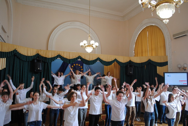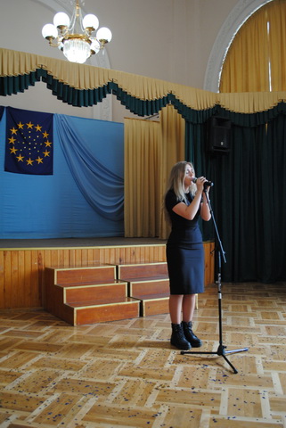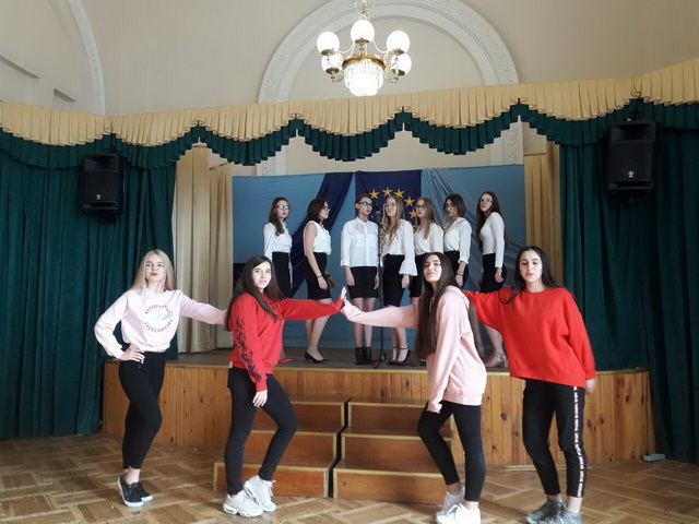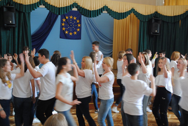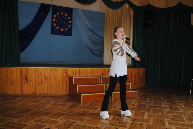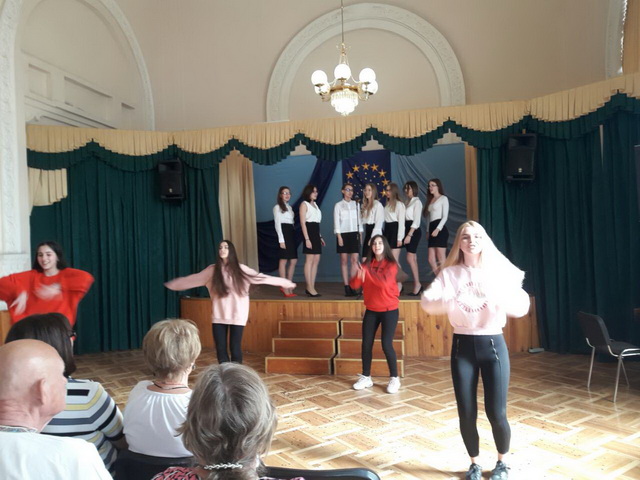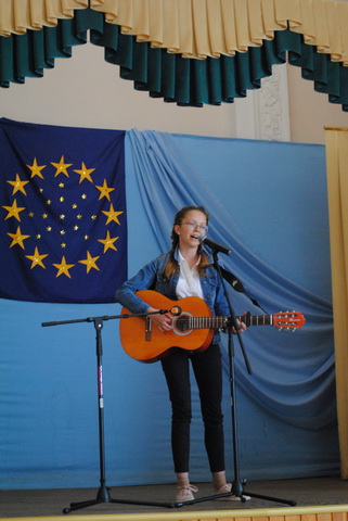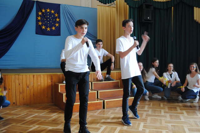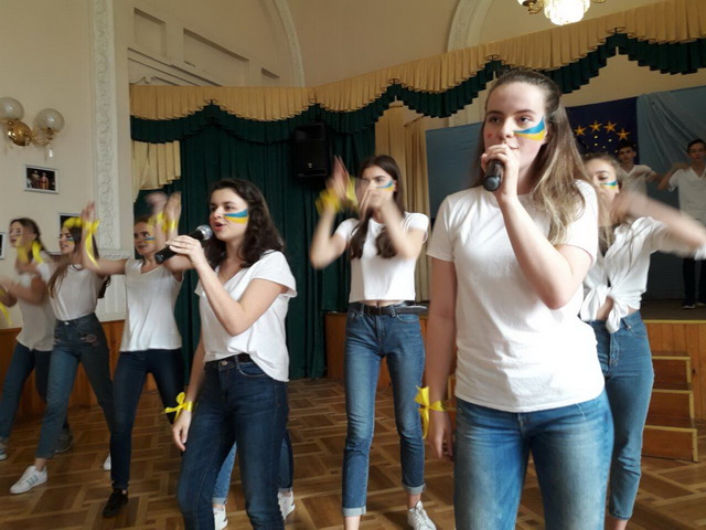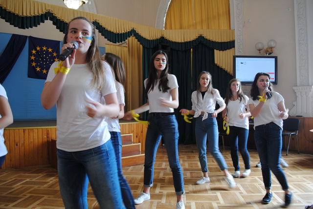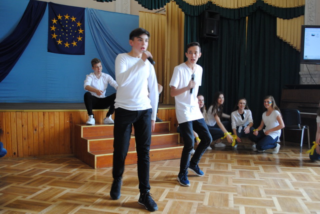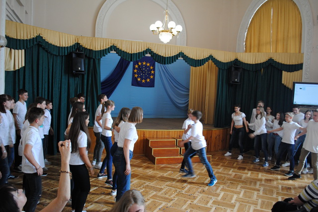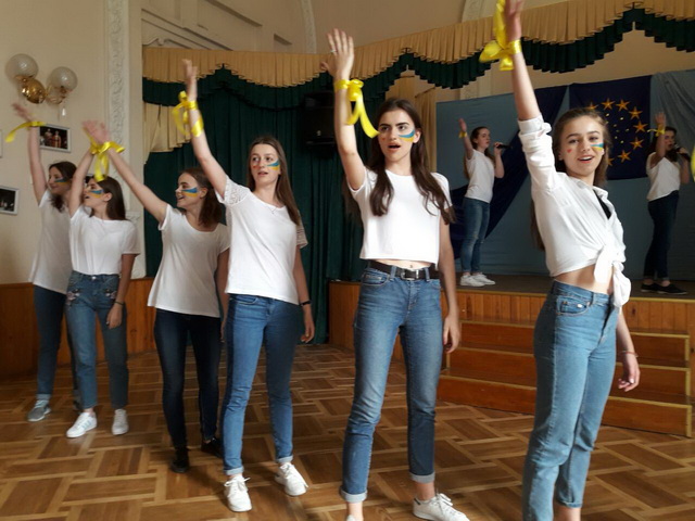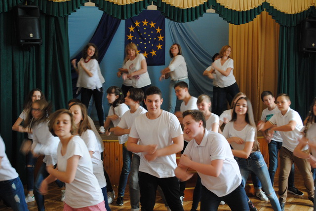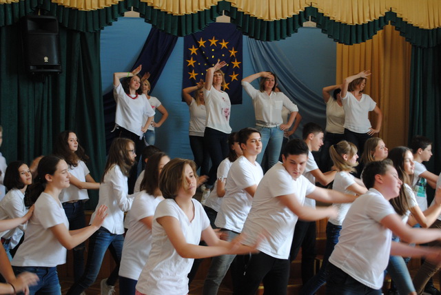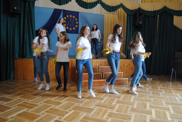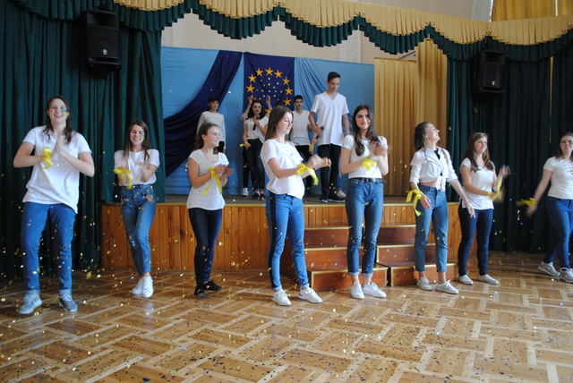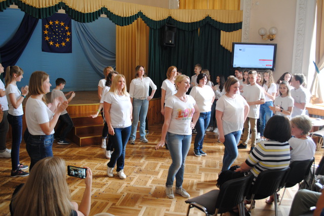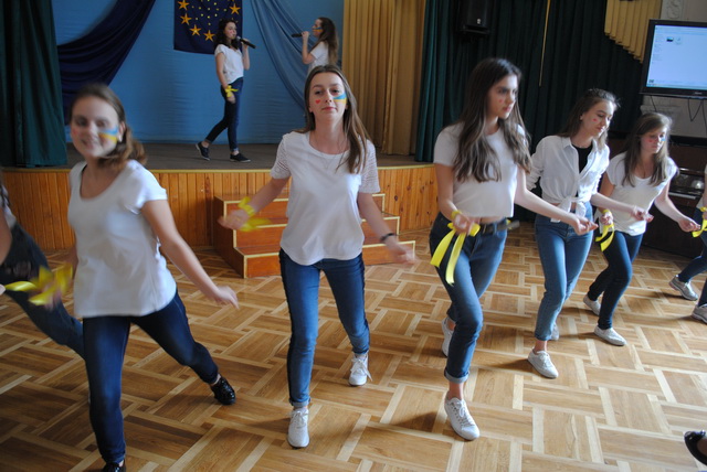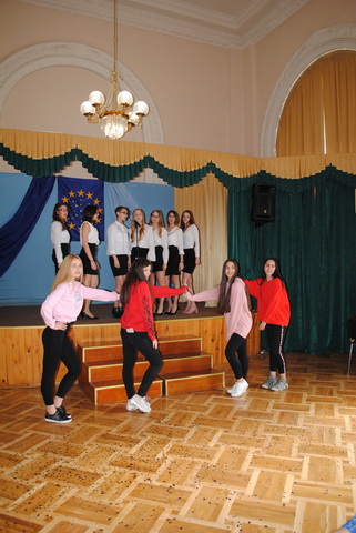 У піснях сплелися французький шарм, англійська витонченість та польський національний запал. Вчителі кафедри іноземних мов разом з гімназистами 8 класів продемонстрували запальний флешмоб « Європа у серці зі мною, Європа у серці з тобою».
