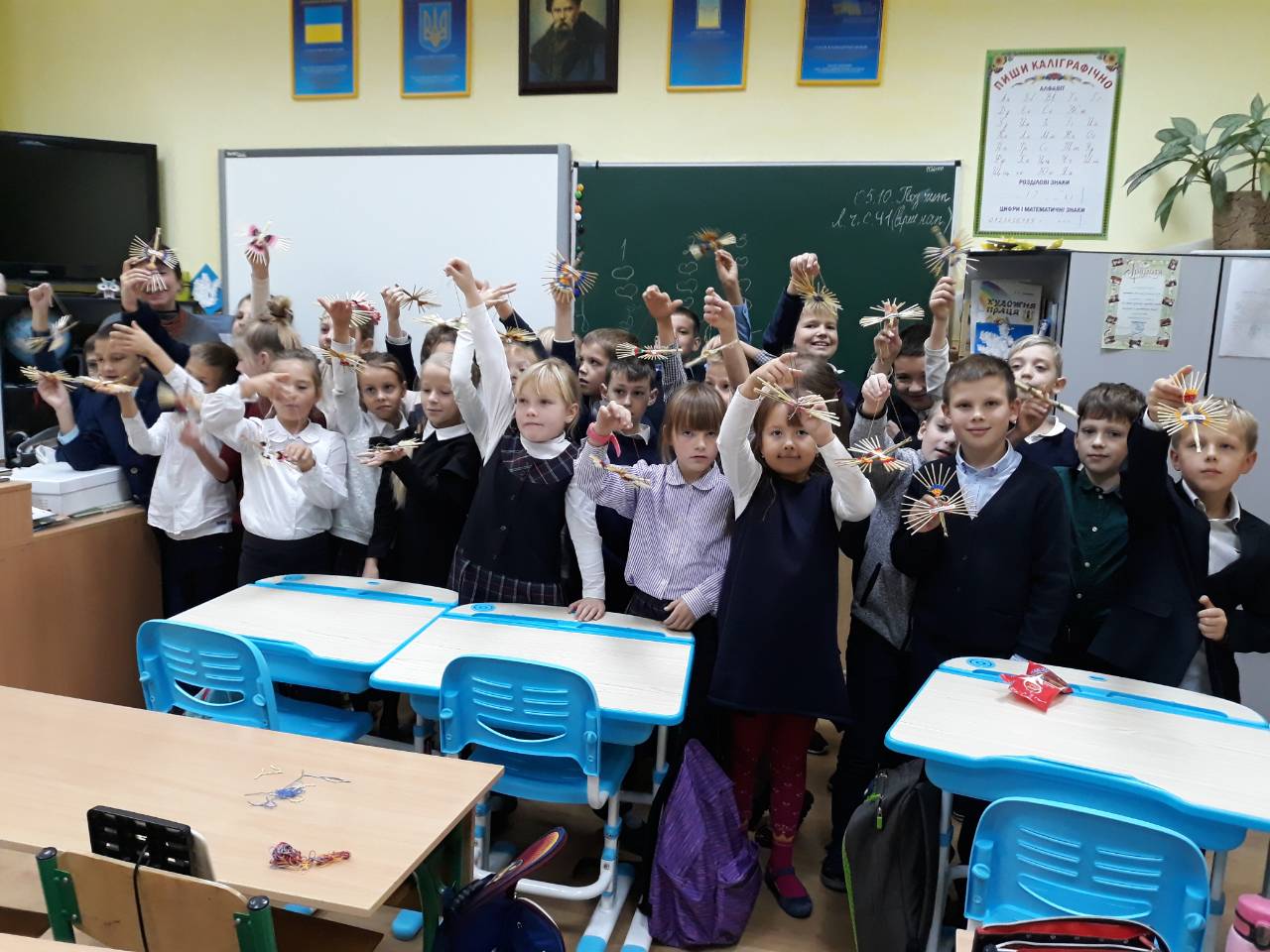 . Діти із задоволенням займалися створенням витвору мистецтва, потім прикрасили деревце у шкільному холі.