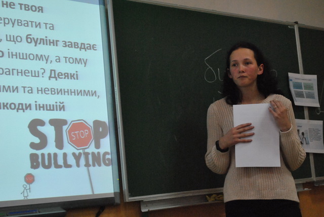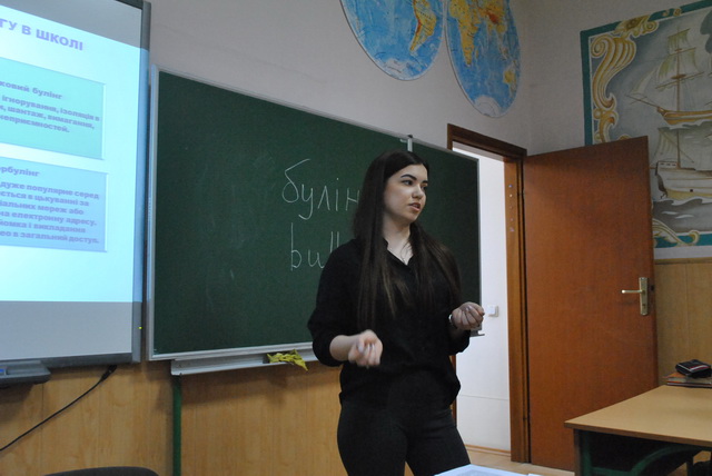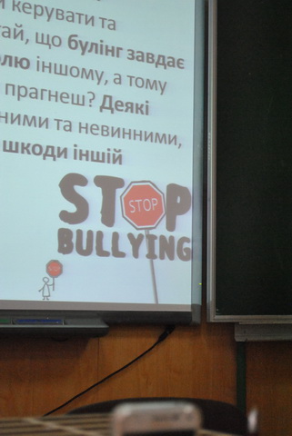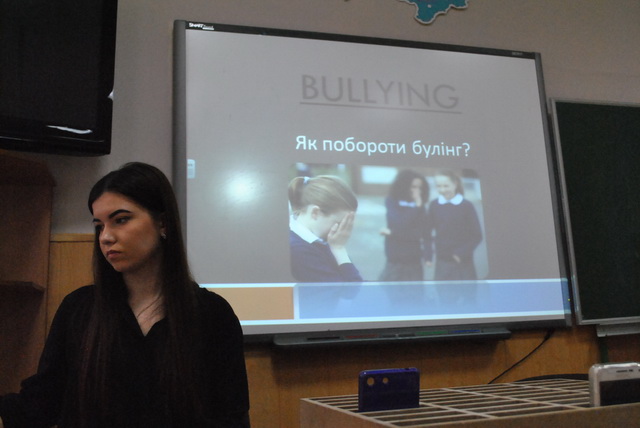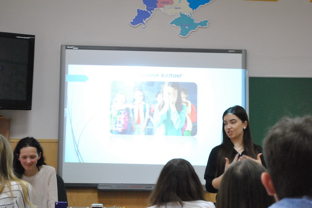 01 березня 2019 року для гімназистів 8-А класу був проведений інтерактивний урок «Особливості та види булінгу в школі» студентами IV курсу напряму підготовки «Соціальна педагогіка» Інституту людини Київського університету імені Бориса Грінченка – Петіною Владою та Лівіцькою Альоною. Під час уроку гімназисти мали змогу висловити свою власну думку, поставити питання, які їх хвилюють, проаналізувати рекомендації щодо уникнення булінгу.