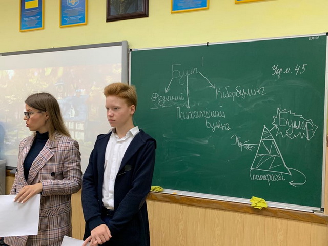 20 вересня 2019 року для гімназистів 4-х класів були проведені інтерактивні заняття за темою «Викресли булінг зі шкільного життя» за участтю магістра ради самоврядування Любчича Олександра та соціального педагога Лашковою Г.С. Діти жваво обговорювали складні питання, зокрема, як ефективно спілкуватися та запобігати ескалації конфліктів.