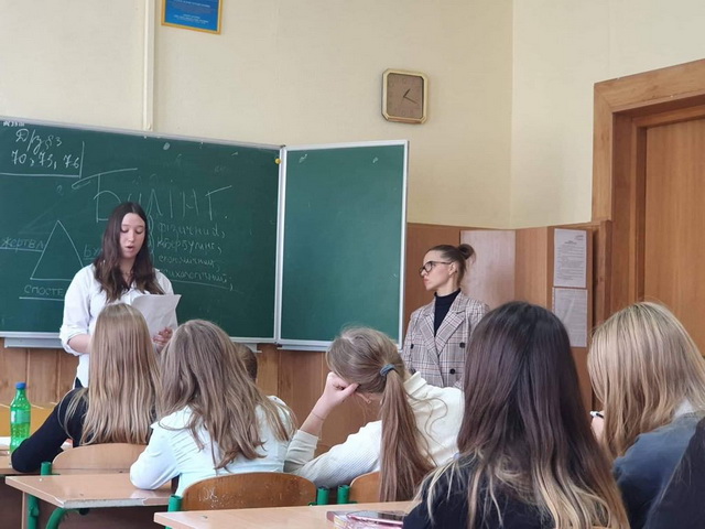 24 вересня 2019 року для гімназистів 7-х класів було проведено інтерактивне заняття «Безпечна школа» за участю членів ради самоврядування та соціального педагога Лашкової Г.С. Обговорювалися поняття булінг, види та форми булінгу, аналізувалися приклади шкільного насилля та прогнозувалися його наслідки.