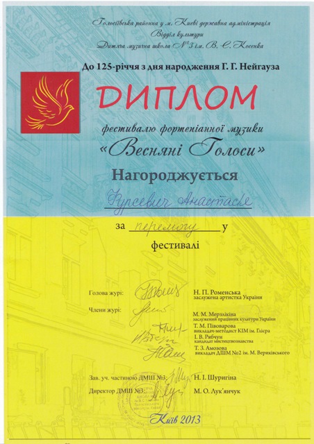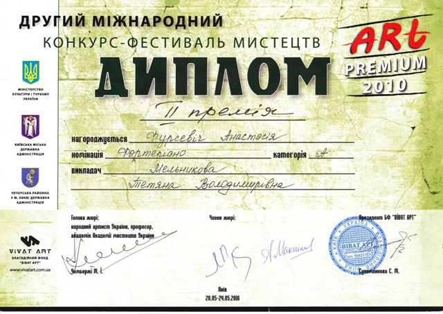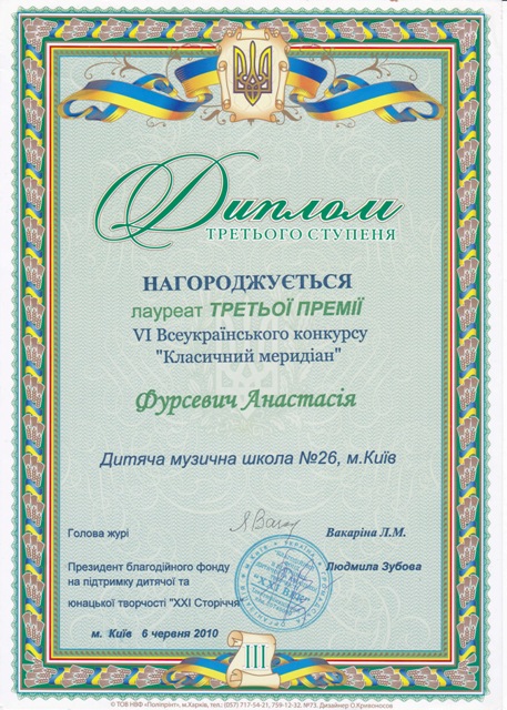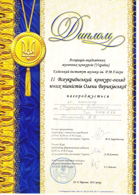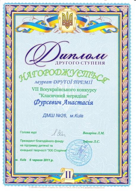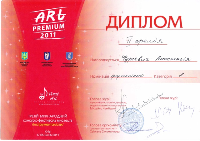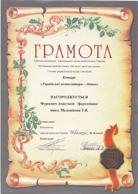 Переможець Регіонального конкурсу-огляду юних піаністів ім. О. Вериківської (2011)
