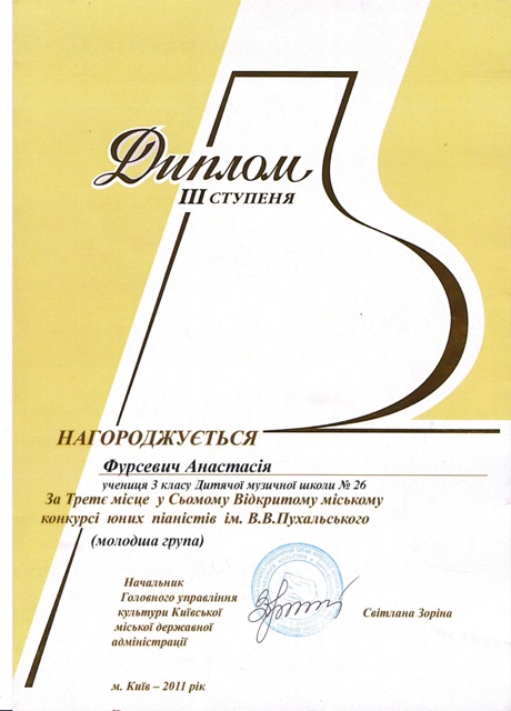 Лауреат III премії у Сьомому Відкритому міському конкурсі юних піаністів ім. В. В. Пухальського (2011)