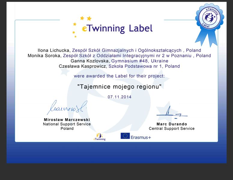 8 грудня 2014 року було проведено нараду серед вчителів кафедри іноземних мов на якій вчитель-ітвіннер Козловська Г.П. доповіла про успішну роботу в програмі eTwinning , про участь у конференції асоційованих шкіл ЮНЕСКО, де учні-ітвіннери мали можливість представити міжнародний проект «Рецепти для дітей» іншим учасникам програми та конференції. (інформація на головному сайти eTwinning Plus