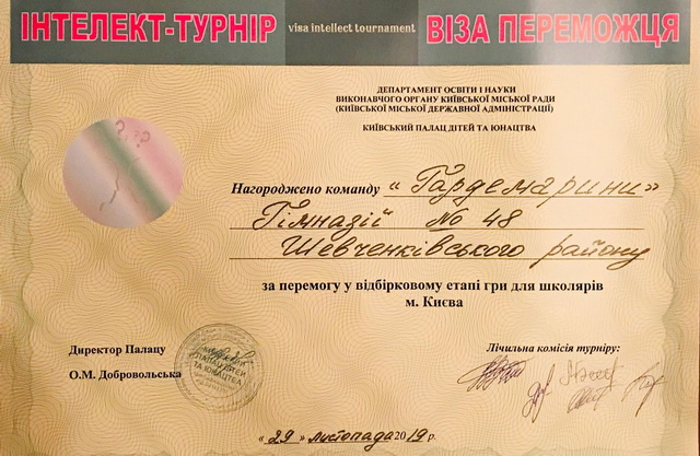 29 листопада 2019 року збірна команда гімназистів 9-х класів «Гардемарини» у складі: Баневича Дмитра, Бордуленко Марії, Зборовського Романа, Єлєніна Гліба, Потапенка Матвія, Черніцькі Андрія, Шпарика Миколи, на чолі з соціальним педагогом гімназії Лашковою Г.С., брала участь у міському вибірковому етапі «Інтелект-турніру – 2019 року» на базі Київського палацу дітей та юнацтва. Команда здобула ІІ місце серед 19 команд та пройшла до фіналу, де будуть змагатися 16 команд міста Києва. Вся гімназійна родина вітає з перемогою!!!