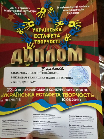 - Вітаємо Сидорову Єву, фортепіано, ученицю 5-Б класу гімназії №48 - з ІІ премією на 23 Всеукраїнському конкурсі-фестивалі "Українська естафета творчості".