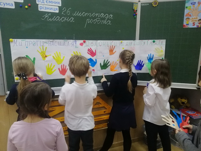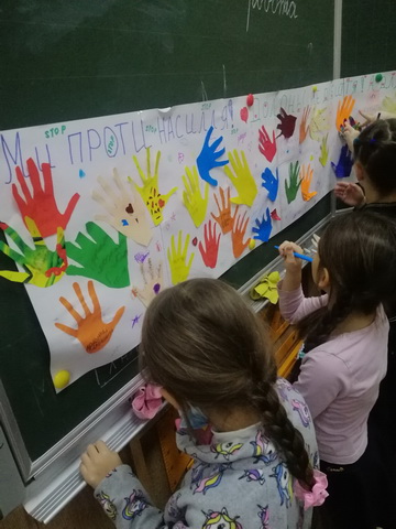 Маленькі гімназисти 2-Б класу разом з психологом Білоноженко М.С. долучилися до акції та створили свій неповторний плакат «Долоньки не для биття!»