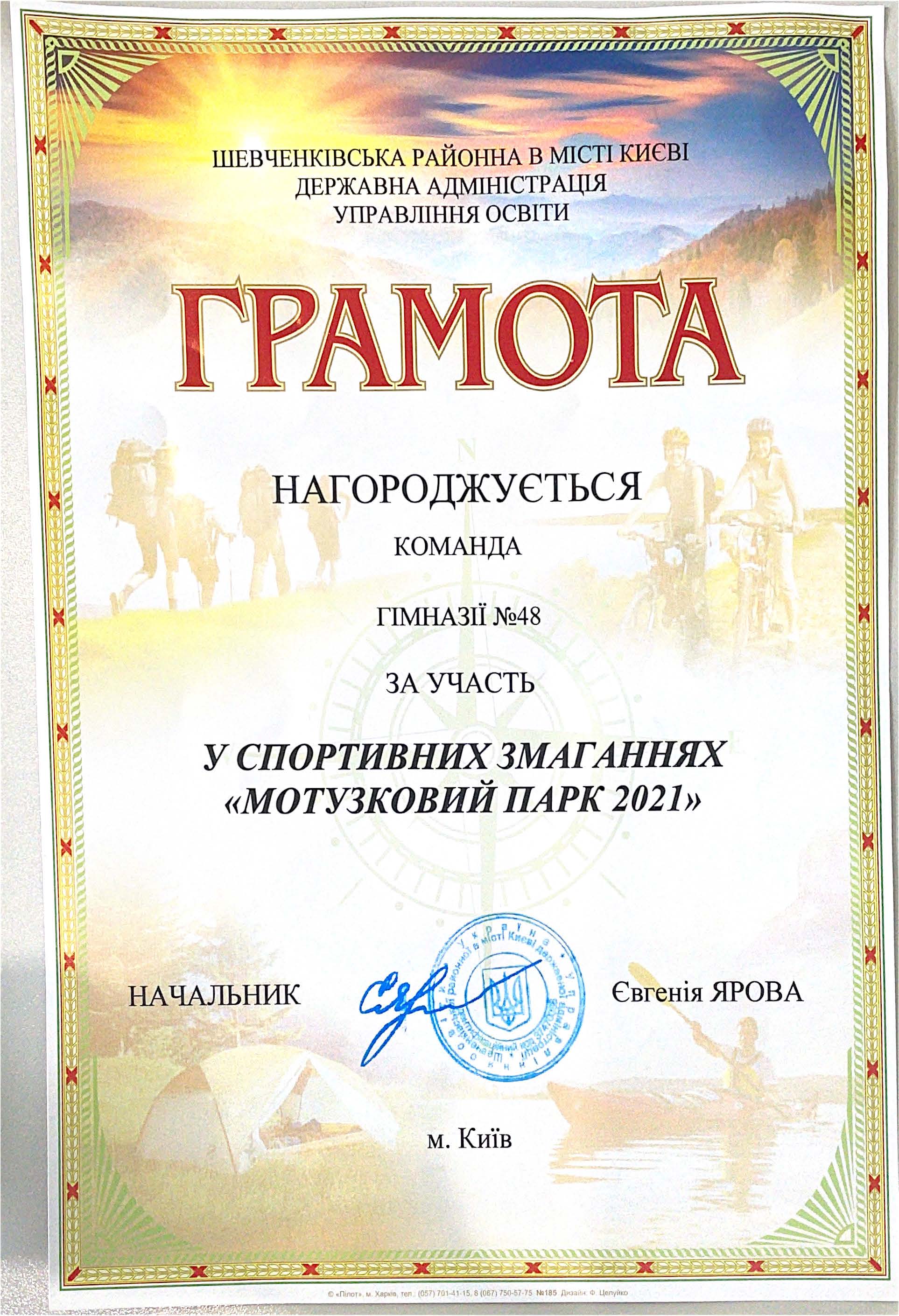 19 травня 2021 року збірна команда 6-Б класу гімназії 48 у складі: Ковальової Дар’ї, Литвінова Стефана, Стуканенко Діани, Черніцькі Ярослава, брали участь у змаганнях «Мотузковий парк-2021» серед учнів ЗЗСО Шевченківського району, на чолі з вчителем фізичного виховання Андрусяком О.Г. Цікаві траси, напружені змагання справили незабутні враження на гімназистів.