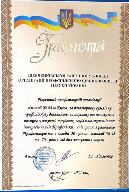 Районна організація профспілки працівників освіти і науки України нагородила Грамотою первинну профспілкову організацію гімназії №48 м. Києва за багаторічну сумлінну профспілкову діяльність, за активну та непохитну позицію у захисті трудових, соціально-економічних інтересів членів Профспілки, співпрацю з районною Профспілкою та з нагоди 30-річчя гімназії №48 та 70-річчя від дня заснування школи. Щира вдячність Чумак Тетяні Леонідівні - Голові первинної організації профспілки гімназії №48 за те, що Ви багато років знаходитесь на передньому краї боротьби за права та інтереси педагогів і медпрацівників гімназії №48, за віру у силу нашої єдності, за спільні і солідарні дії у відстоюванні гідності людей праці, їх достойного життя і соціальної справедливості!