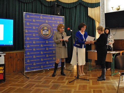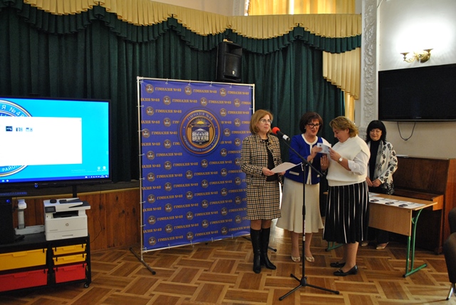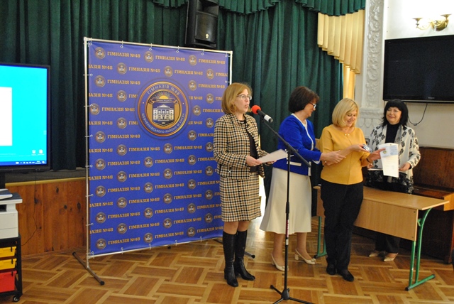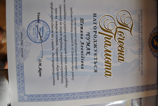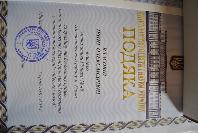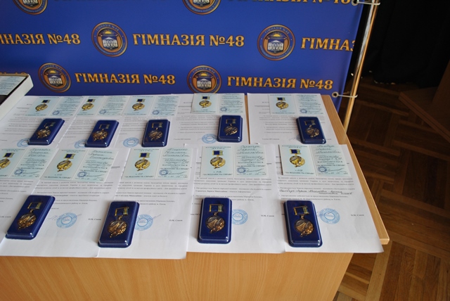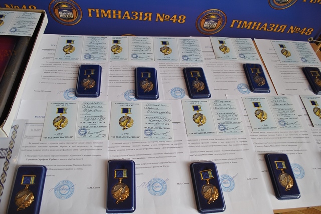Маріанна Іванівна вручила нагрудний знак «Знання, душу, серце - дітям» вказаним вчителям гімназії під час святкування професійного свята. Подякою Міністерства освіти і науки України нагороджено Власову Ірину Олександрівну- вчителя математики гімназії №48, - за сумлінну та бездоганну працю, плідну педагогічну діяльність, високі досягнення у навчанні та вихованні учнівської молоді. Почесною грамотою Київської мвської організації профспілки працівників освіти і науки України нагороджено Чумак Тетяну Леонідівну - голову первинної профспілкової організації, завідувача бібліотекою гімназії №48, - за самовіддане служіння профспілковій справі, активну роботу, спрямовану на захист трудових, соціально-економічних прав та інтересів освітян, зміцнення і збереження профспілкової єдності та з нагоди Дня працівників освіти.