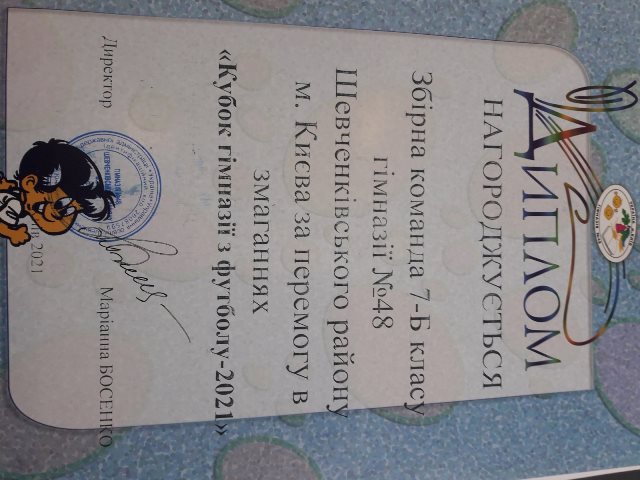 На передодні свята Дня Захисників та Захисниць України в гімназії №48 підведені підсумки змагань «Кубок гімназії з футболу-2021». Головний суддя змагань Андрусяк О.Г. вручив перехідний кубок та грамоту переможцям цьогорічного турніру – збірній команді 7-Б класу, класний керівник Чистяк О.І. Вітаємо з перемогою!