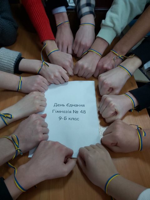 16 лютого 2022 року гімназійна родина гімназії №48 долучилася до відзначення Дня єднання. Ланцюги єдності, урочисте виконання Державного Гімну України та участь у флешмобі на Хрещатику об’єднали усіх у щирому прагненні панування миру в Україні. Слава Україні!