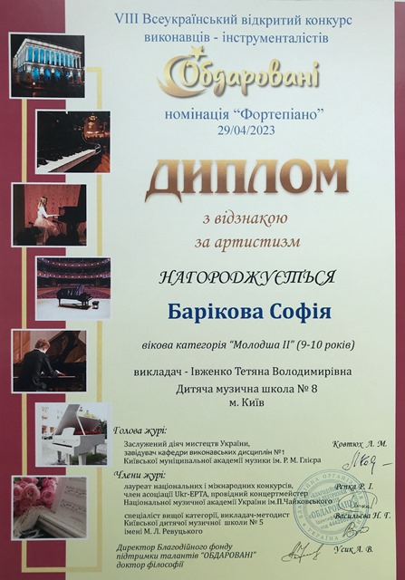 Вся гімназійна родина з великою радістю вітає ученицю 4-А класу Барікову Софію, яка стала лауреатом II премії та одержала диплом з відзнакою за артистизм на VIII Всеукраїнському відкритому конкурсі виконавців-інструменталістів «Обдаровані» в номінації «Фортепіано».