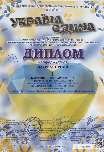Щиро вітаємо із заслуженою перемогою на III Всеукраїнському двотуровому конкурсі-фестивалі мистецтв «Україна єдина» ученицю 4-А класу Софію Барікову, яка стала лауреатом I премії. Бажаємо нашій зіроньці ніколи не зупинятися на досягнутому, успіхів, творчого натхнення та позитиву кожен день, а також великого майбутнього, у якому вона здобуде ще багато славних перемог.