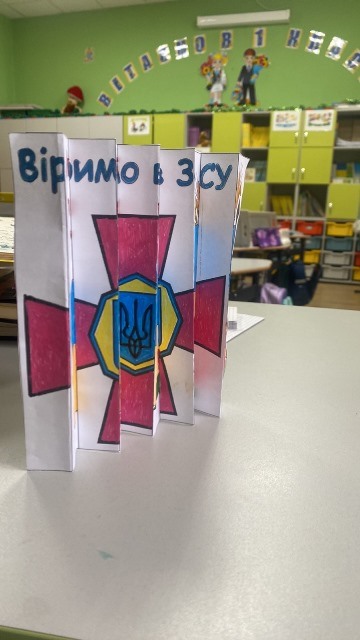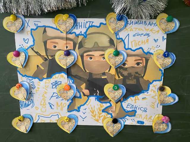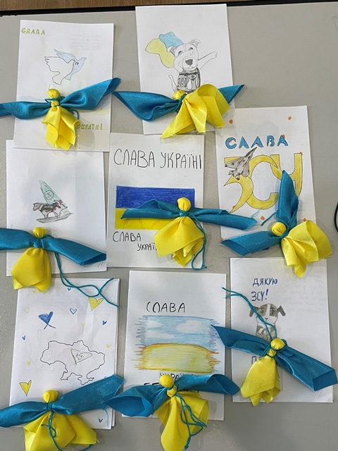 06 грудня 2023 року учні 1-А класу гімназії №48, класовод Горбаньова І.В. виготовили листівки і сердечка , щоб привітати воїнів ЗСУ. Сердечка доробляли в укритті, бо розпочалася повітряна тривога. Учні 8-9 класів підготували обереги та листівки побажання.