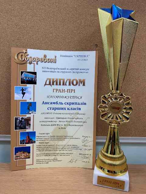 Щиросердечно вітаємо учнів гімназії №48 9-А класу Макаренко Еліну та Максима та ученицю 9-Б класу Остапенко Олену, вихованців ДШМ №2 ім. М.І. Вериківського, які у складі ансамблю скрипалів старших класів отримали диплом «Гран-прі» на ХІІ Всеукраїнському відкритому конкурсі виконавців на струнних інструментах в номінації «Скрипка».