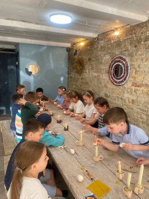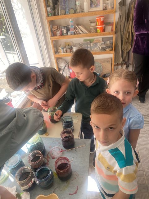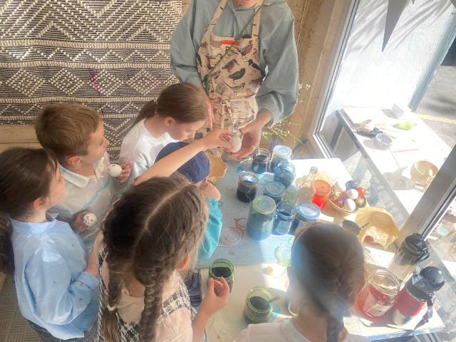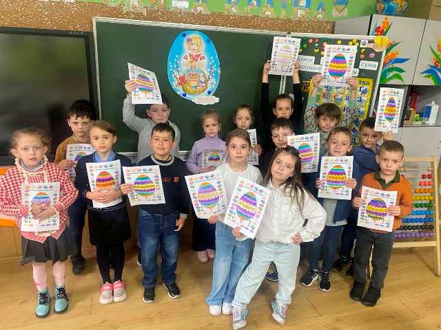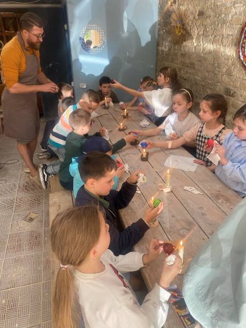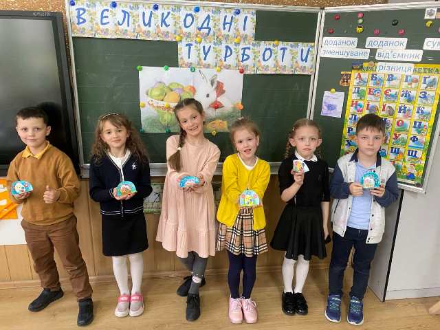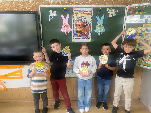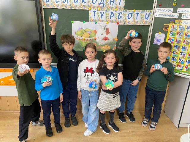 Учні 1-А класу гімназії №48 старанно підготувалися до Великодня: розфарбували яєчка з математичним завданням, зробили листівки для рідних, прикрасили пластиліном курчаток, а також власноруч розписали писанки в гончарній майстерні «Яр».