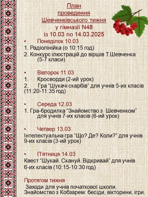 10 березня 2025 року – проведено радіолінійку для 1-11 класів та конкурс ілюстрацій до віршів Т. Шевченка серед учнів 5-7 класів.