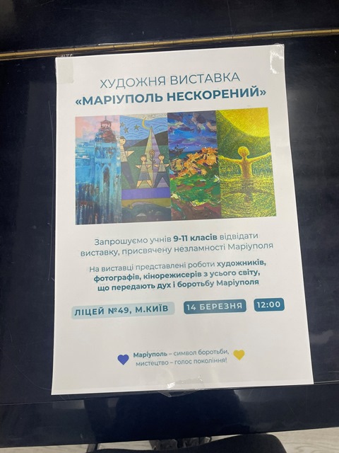 20 березня 2025 року учні 10-11-х класів гімназії №48 разом з класними керівниками відвідали художню виставку «Маріуполь нескорений». Картини, сповнені болю, надії та сили, розповіли дітям історію міста, яке стало символом незламності. На виставці представлені роботи художників, фотографів, кінорежисерів з усього світу, що передають дух і боротьбу Маріуполя.
