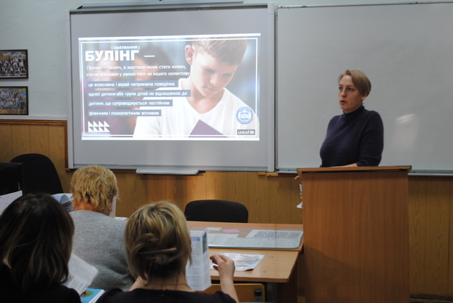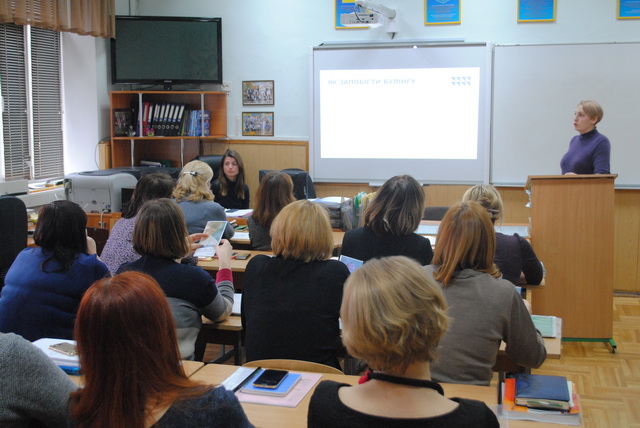 20 лютого 2018 року в гімназії №48 відбулось розширене методичне об’єднання класоводів та класних керівників. Практичні психологи Заневська Д.Ю. та Білоноженко М.С. надали алгоритми дії для всіх учасників та рекомендації щодо профілактики протидії булінгу в гімназійному середовищі.