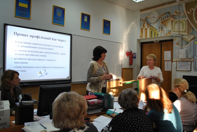 17 лютого 2014 року відбулась педагогічна рада. Темою обговорення було «Профільне навчання як шлях до комунікативно-діяльнісного  характеру оволодіння іноземною мовою в інтеграції з міжкультурним спрямуванням його змісту».  Заступник директора з навчально-виховної роботи Товкачевська О.А. в своєму виступі приділила увагу питанню профільного навчання в старших класах гімназії, яке спрямоване на систематизацію та узагальнення мовного, мовленнєвого та комунікативного досвіду учнів гімназії, набутого ними на початковому і середньому етапах навчання. Виступаючі вчителі кафедри іноземних мов гімназії відзначали, що відповідні результати  з профільного навчання можуть бути отримані лише за умов злагоджених дій вчителів, що викладають профільний предмет; проводять профільний моніторинг; психологів, які створюють психологічний супровід, та класних керівників.