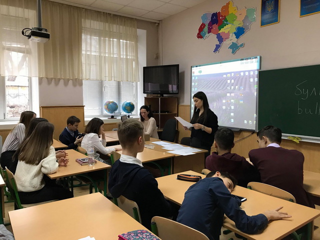 01 березня 2019 року для гімназистів 8-А класу був проведений інтерактивний урок «Особливості та види булінгу в школі» студентами IV курсу напряму підготовки «Соціальна педагогіка» Інституту людини Київського університету імені Бориса Грінченка – Петіною Владою та Лівіцькою Альоною. Під час уроку гімназисти мали змогу висловити свою власну думку, поставити питання, які їх хвилюють, проаналізувати рекомендації щодо уникнення булінгу.