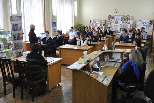До Дня української писемності та мови 11 листопада 2015 року учні 10-Б класу на чолі з вчителем української мови та літератури Терентьєвою Т.М. зустрілися з українським письменником Анатолієм Самойленком. Учні з цікавістю слухали вірші та долучилися до цікавої розмови - презентації книги «Негаснуча зоря Тараса» на базі бібліотеки ім. Є. Плужника.