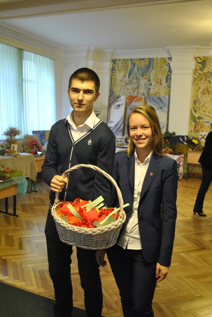Цього святкового ранку члени ради самоврядування учнів 8-10 класів на чолі з магістром – учнем 10 – Б класу – Науменком Михайлом сердечно вітали вчителів з професійний святом власноруч виготовленими квітами-цукерками з побажаннями.