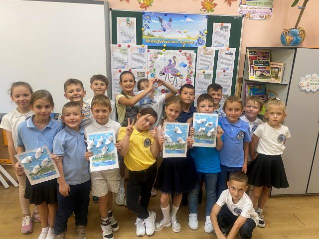 08 вересня - Міжнародний день журавля. Учні 2-А класу гімназії №48 на уроці образотворчого мистецтва під керівництвом класовода Горбаньової І.В. працювали по групах, розмальовуючи частину картини «Журавлі». А на уроці дизайну і технології зробили обʼємну аплікацію «Журавлі в небі».